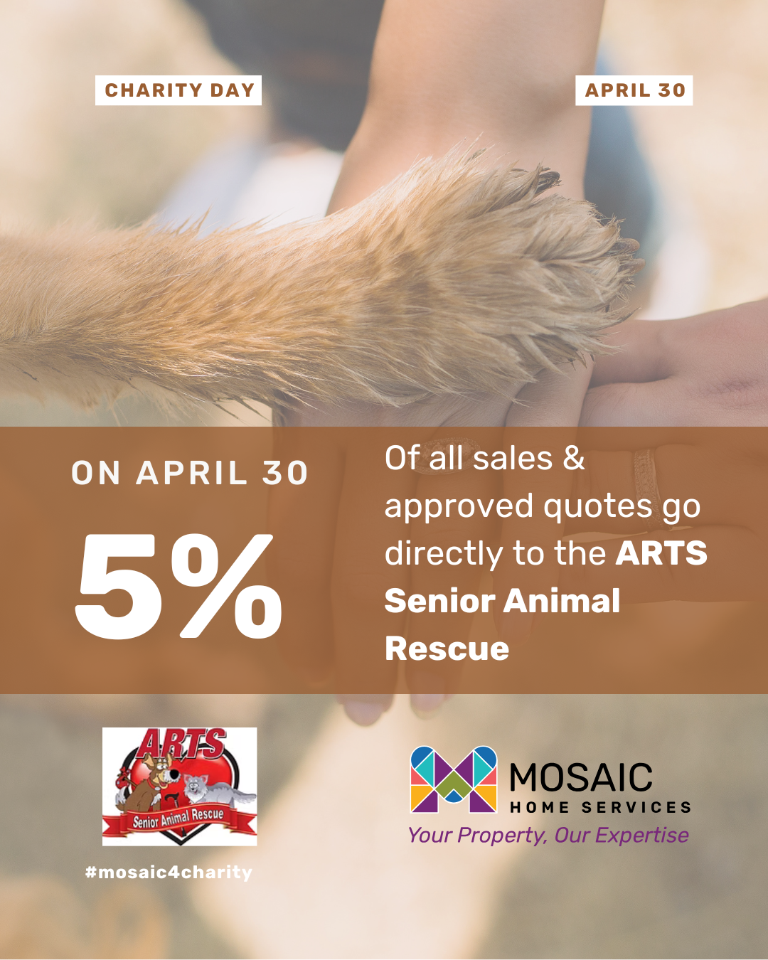 On Thursday, April 30, 2026, 5% of all sales and approved quotes from our family of brands will be donated directly to ARTS Senior Animal Rescue to support their rescue and foster programs.